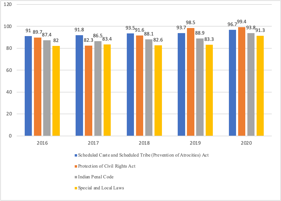 Figure 2 shows conviction rates, i.e., the percentage of cases that came to trial and received convictions. It indicates that SCs are disadvantaged even in the eyes of justice. So, longer delays in trials and lesser conviction rates affect the fundamental protections guaranteed under their citizenship rights and act as a licence for other castes to discriminate against Dalits.